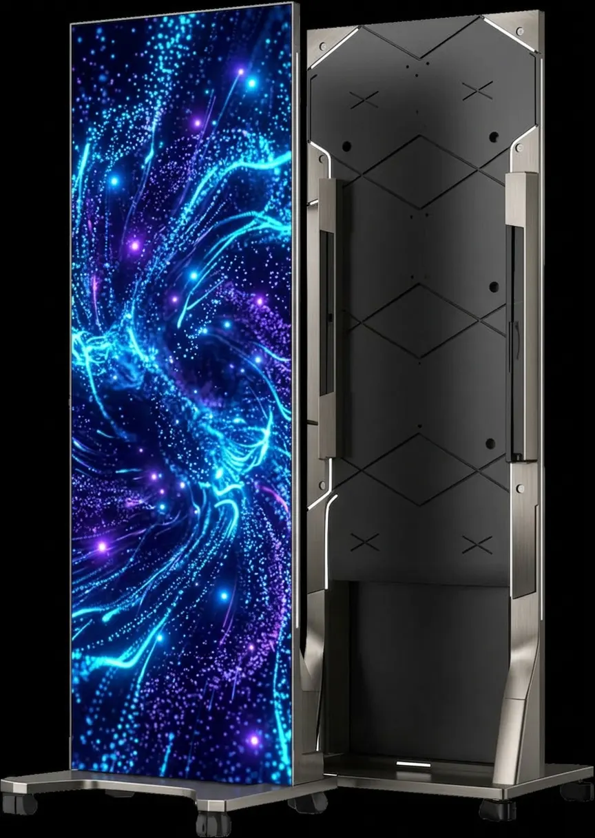En Plug and Play alquilamos tótems LED / pósters LED modulares para ferias, congresos, stands y eventos corporativos en Madrid y toda España. Son pantallas verticales de alto brillo pensadas para mostrar vídeo, promociones, agenda, señalética o patrocinadores con un formato elegante y muy llamativo.